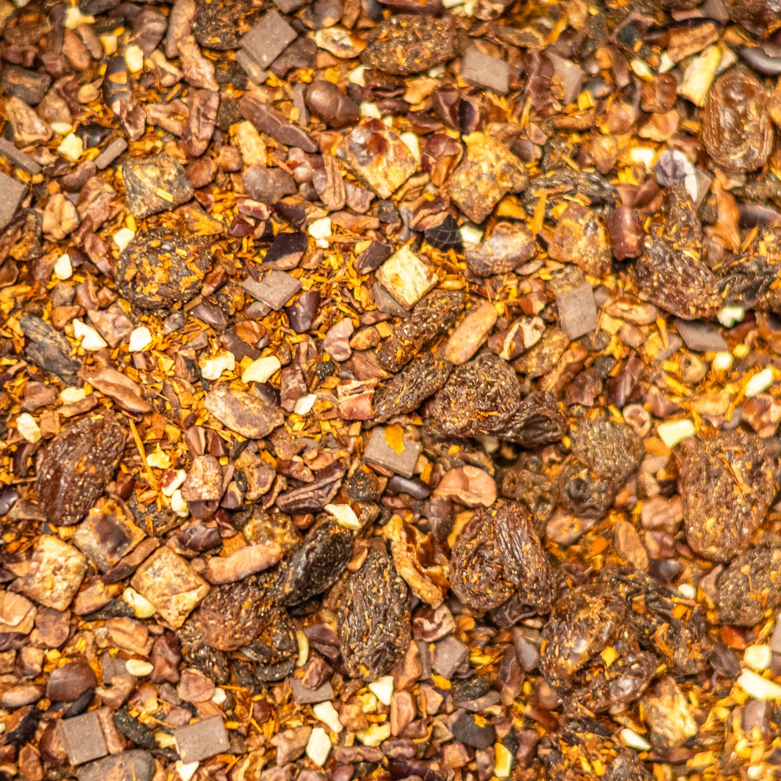 Ingrédients : Fève de cacao concassée, Rooibos Super Grade, raisin, datte, Honeybush, racine de chicorée, Chocolat , NOISETTE, arôme.