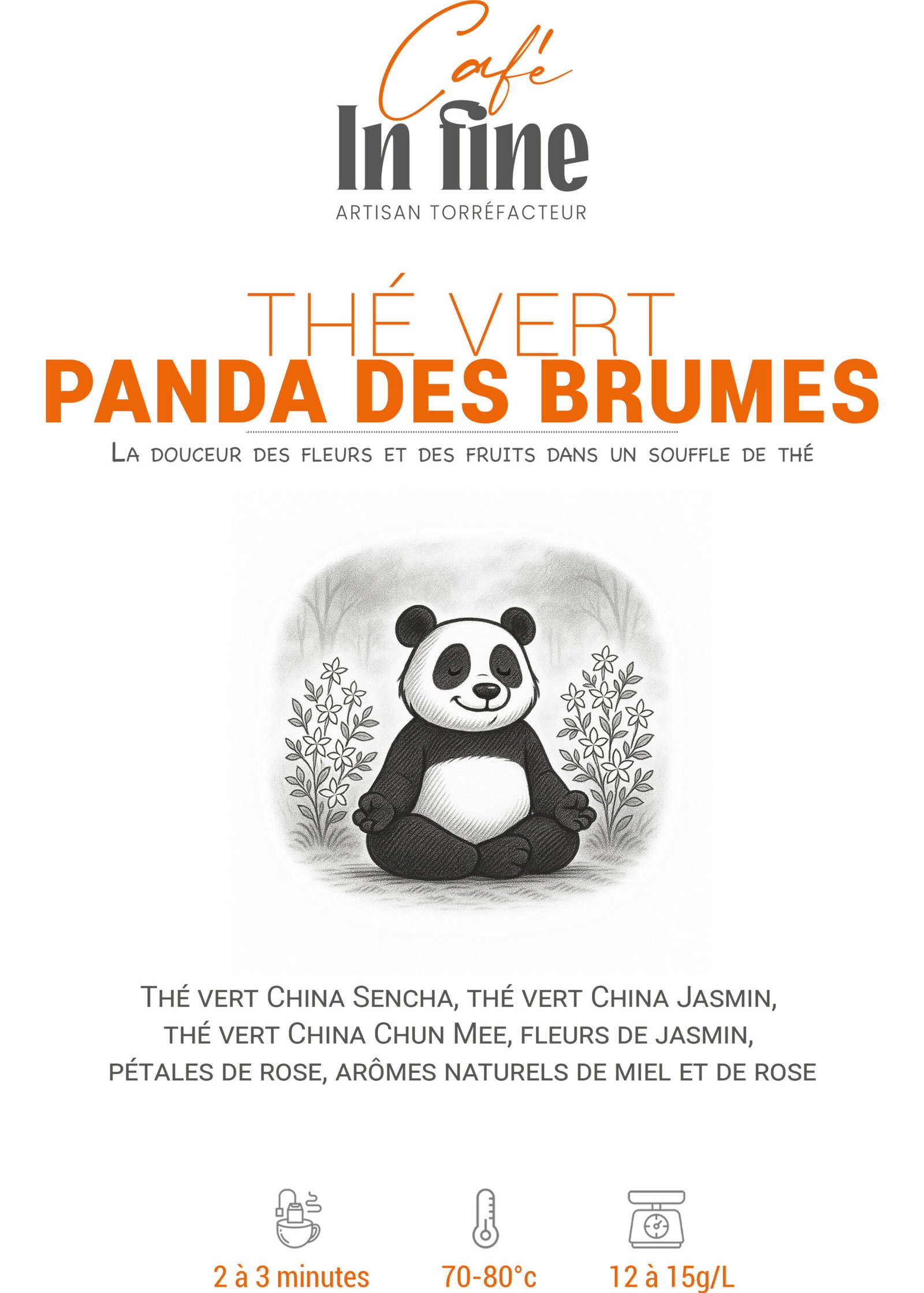 On raconte qu’au cœur des brumes de Chine, un panda rêveur cueille les fleurs et fruits du matin ; de ce rituel naît un thé doux et velouté, empreint de jasmin, de rose, de miel et de litchi.